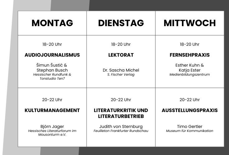 Um flexibel auf aktuelle Gegebenheiten reagieren zu können, bleibt vorbehalten, gelegentlich einen ganzen Kurs auszutauschen. Es kann sein, dass in kommenden Jahrgängen Themen und/oder Dozent*innen wechseln.